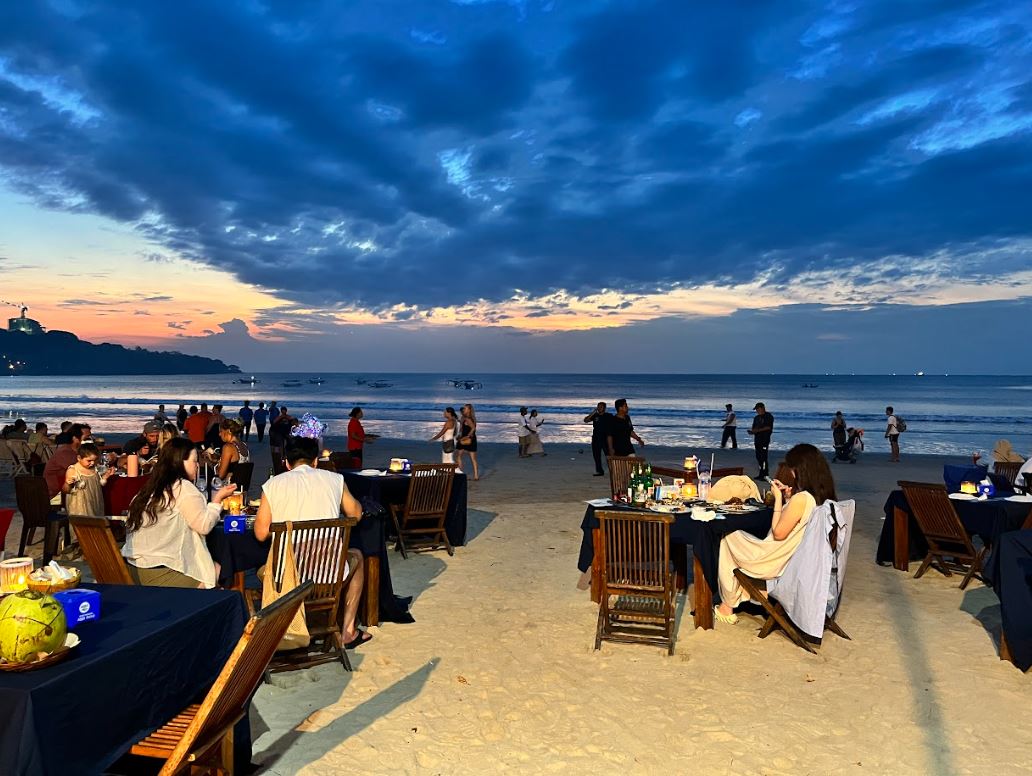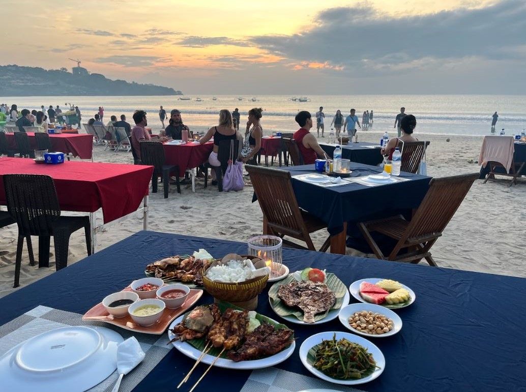 짐바란 해변의 모래사장에 놓인 테이블에 앉아서 신선하고 다채로운 해산물들을 즐기며,